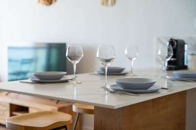 - Une cuisine entièrement équipée : four, micro-ondes, réfrigérateur, lave-vaisselle, machine Nespresso, cafetière filtre, grille-pain…