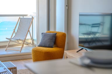 - Un salon cosy avec grande baie vitrée ouverte sur la mer et un canapé convertible