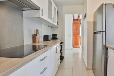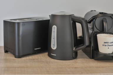 - d’une cuisine équipée : four, micro-ondes, réfrigérateur, congélateur, lave-vaisselle, cafetière à filtre et Nespresso, grille-pain, etc.