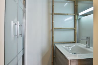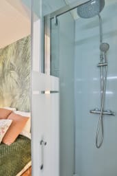 - une grande salle de bain avec douche et wc, équipée d’un lave-linge séchant, d’un sèche-cheveux et d’un sèche-serviettes.