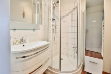 - Une salle de bain avec douche équipée d’un lave linge, d’un sèche serviette et d’un sèche-cheveux.